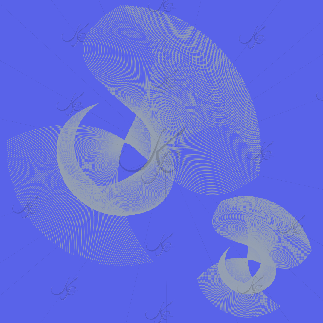 This abstract digital artwork features an intricate composition of overlapping curved forms and fine linear patterns set against a vibrant periwinkle blue background. The piece showcases delicate spiral and wave-like structures created through precise line work, with translucent crescent shapes intersecting to create depth and movement. The monochromatic color scheme in shades of blue and gray gives the work a serene, meditative quality, while the mathematical precision of the lines suggests themes of geometry, infinity, and natural patterns. The overall effect is both calming and mesmerizing, evoking imagery of cosmic phenomena, sound waves, or fluid dynamics.