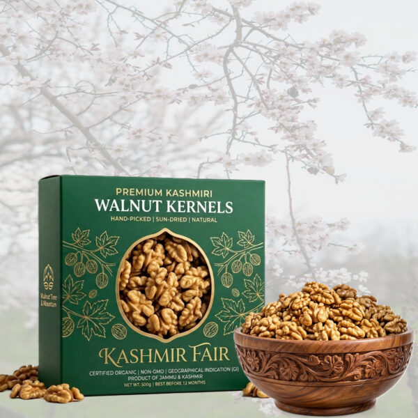 Kashmiri walnut kernels are premium-quality nuts sourced from the high-altitude valleys of Kashmir, widely renowned for their superior taste, quality, and nutritional benefits. They are organically grown with no fertilizers or sprays used on the plants.